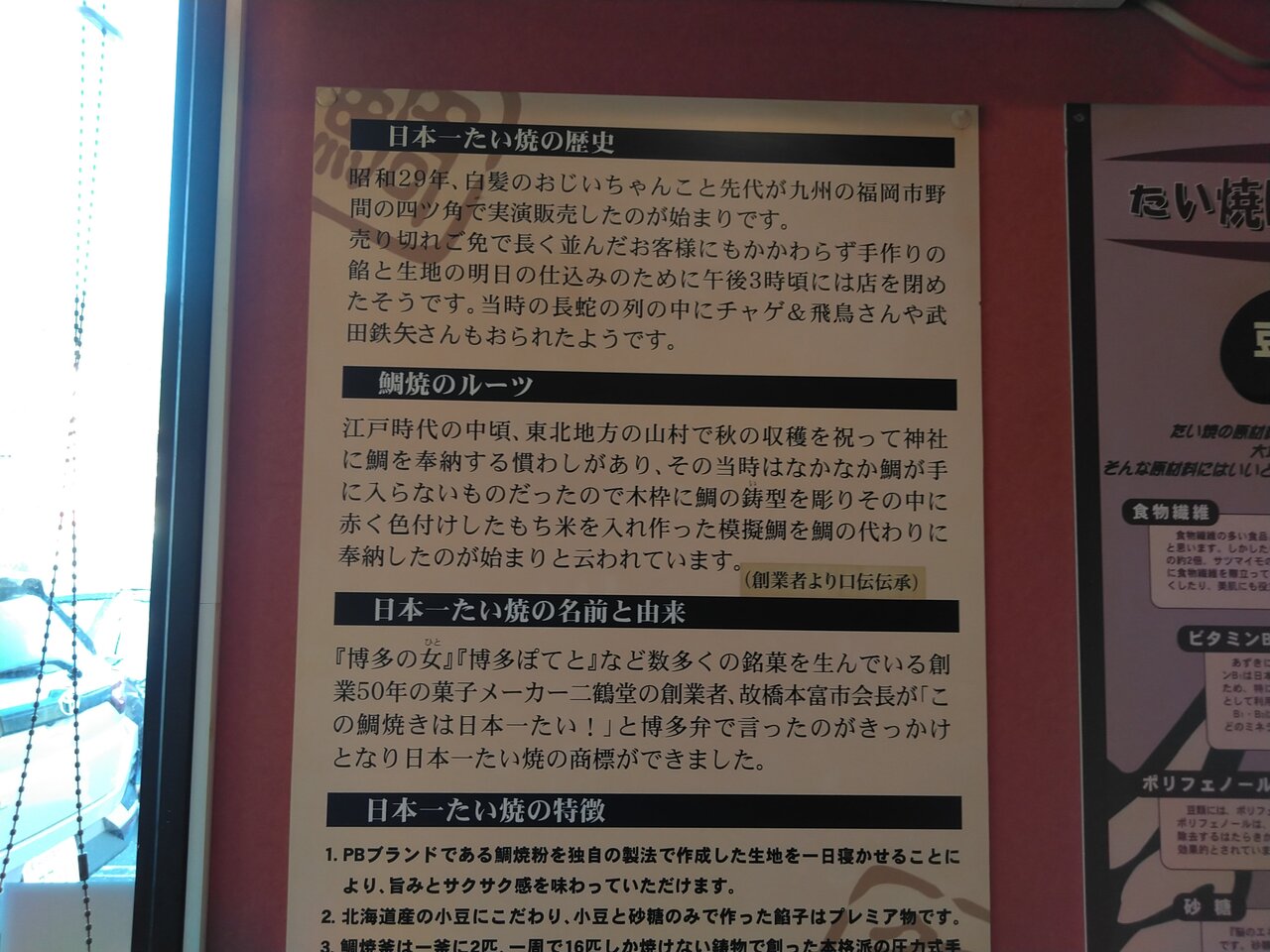 日本一のたい焼きという大きな看板を見て幾年。海水浴の往路では早すぎて開いてなく、復路でも遅すぎて開いていませんでした。今回初めて入りました。人気のお店でした。皮は薄くあんこがたっぷり入っていました。残念ながら、白あんは売り切れていました。次回の楽しみにしませう!