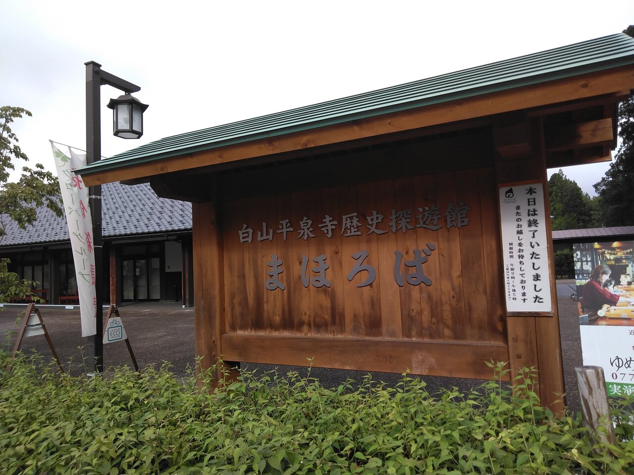 白山平泉寺に立ち寄るならまずはここで情報収集がいいと思います。狭い道を通ってくると、ど~んとインパクトあるくらいの建物です。すぐ横に、駐車場もトイレも東尋坊の碑もあります。でも、時間が早いとしまっています。あさイチの平泉寺はきれいなんだけどなあ
