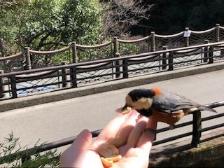 朝ごはんを食べてすぐだったのでビンに入ったハチミツを買いました。小鳥と触れ合えるとネットで見かけたので聞いてみると、今の時期だともう来ないかもとのことでしたがしばらく待つとヤマガラが飛んできてピーナッツをぱくりと。貴重な体験ができて良かったです。