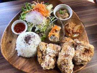 デザートに力を入れているカフェだというのを紙面で見て気になっていたお店、ランチで利用しました。ランチメニューはワンプレート、オムライスやタコライスやカレーがありオムライスやタコライスも気になったけどメインが選べるワンプレートランチ880円(税別)を頼みました。ボリュームがありおなかいっぱいになりました。