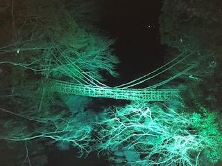 宿泊したホテルかずら橋が開催してくれている無料ツアーに参加しました。雰囲気のあるボンネットバスでかずら橋へ。ライトアップされたかずら橋は、昼間の雰囲気とはちょっと違って幻想的できれいでした。人もあまりいなくてゆっくり楽しめました。