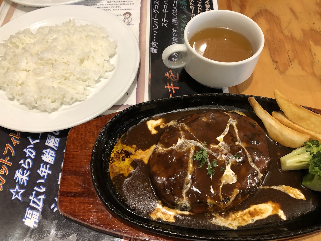 開店直後に入るとすでにお客さんがいて、その後も続々とお客さんが来ました。デミグラスハンバーグ1,000円(税別)を注文しました。ランチタイムはごはんとスープが無料で付いていてお得でした。食感のしっかりしたハンバーグで、付け合わせのフライドポテトも温野菜もおいしかったです。