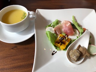 ランチを食べに行きました。日差しが差し込むおしゃれな雰囲気のレストランでした。オードブル、スープ、サラダ、メイン、ごはん(パン)、コーヒーでボリュームのある内容で、メインが肉か魚か選べて肉を選びました。チキン2種類と大きめのポークで食べ応えがあるランチでした。野菜もたくさん使われていて健康的だと思います。
