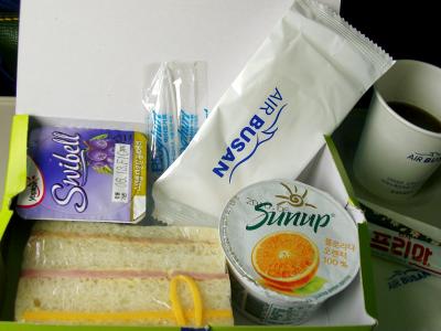 軽食が出ました^^サンドイッチにヨーグルト、オレンジジュースト...