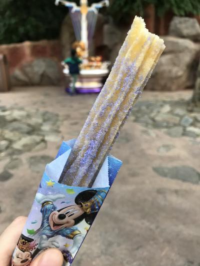 紫色のチュロスを食べ歩きしている人たちを見かけて、好奇心を刺激され、買いに行きました。35周年記念のスペシャルチュロスでした。とはいえ、チュロス自体は普通のもので、紫色の砂糖がまぶしてあるだけで、味はいたって普通。