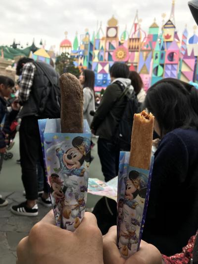 パイ皮に包まれた、細長いおやつ。ファンタジーランドのイッツアスモールワールドの前のあたりの屋台です。アトラクションの待ち時間、小腹がすいたときに食べるのにちょうど良い。チョコ味は甘さ控えめ。しょっぱいチリコンカンも美味しかった。