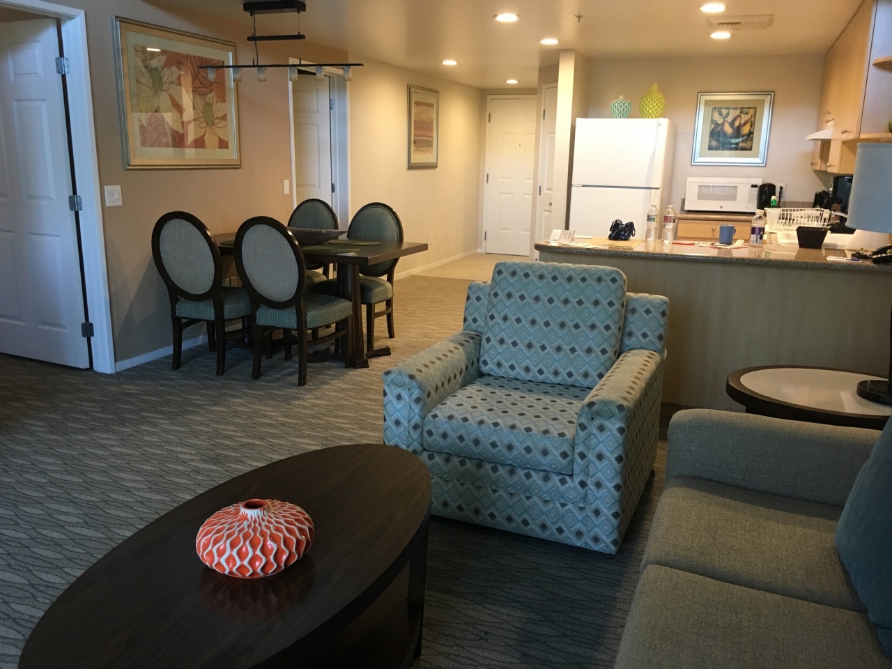 ヒルトンのタイムシェアで利用。フラワーフィールドの側です。部屋は広々としており、キッチンもあって、長期滞在に便利。車がないと不便ですが、車ですぐのところにスーパーやアウトレットもあります。ジムもあるので運動もできます。