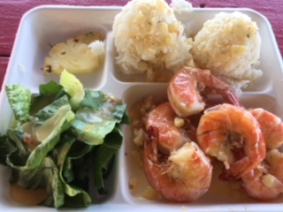 人気のお店らしく、アクセスが不便な場所にもかかわらず、たくさんの日本人がガイドさんに連れられて訪れていました。私たちはレンタカーでカメハメハハイウェイをドライブ中に立ち寄り。外で食べるガーリックシュリンプは最高です。大振りのエビ。13ドル。