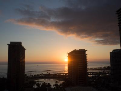 部屋に着いて窓を開けると目の前に夕日がとてもきれいです。とてもテンションが上がります。ハワイアンビレッジの一番奥なのに海が目の前に見えます。ワイキキアンやラグーンタワーと比べると、けっこうモダンな感じの内装でした。