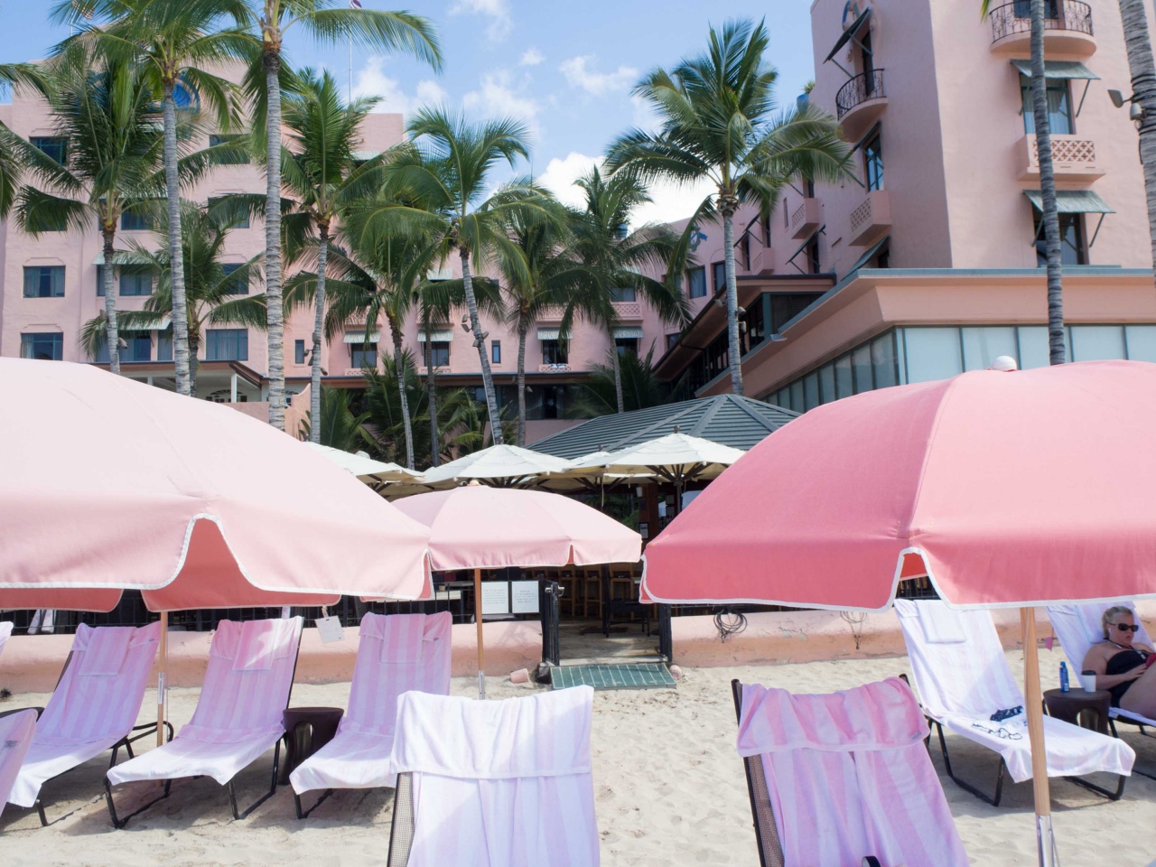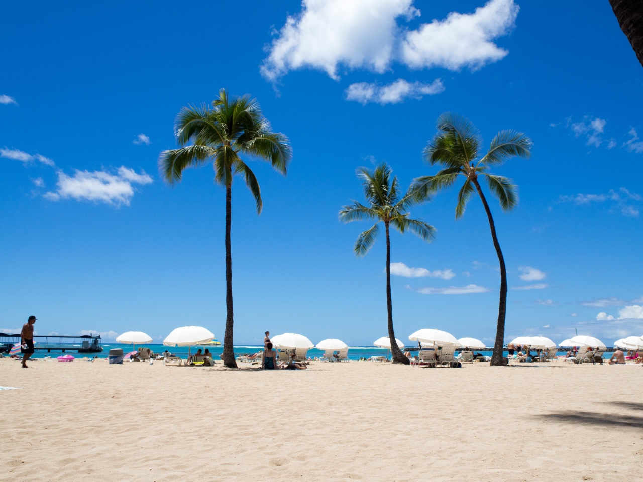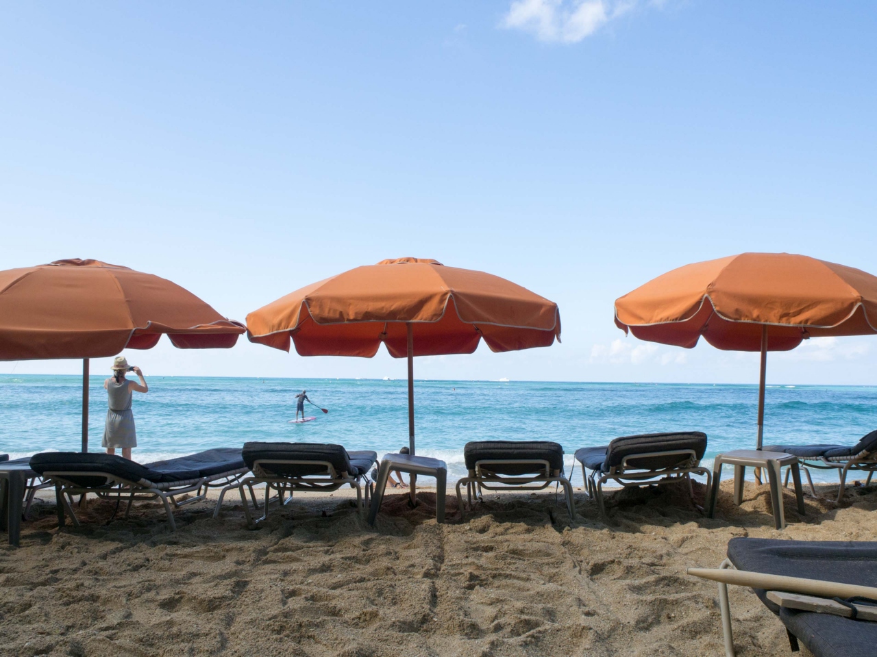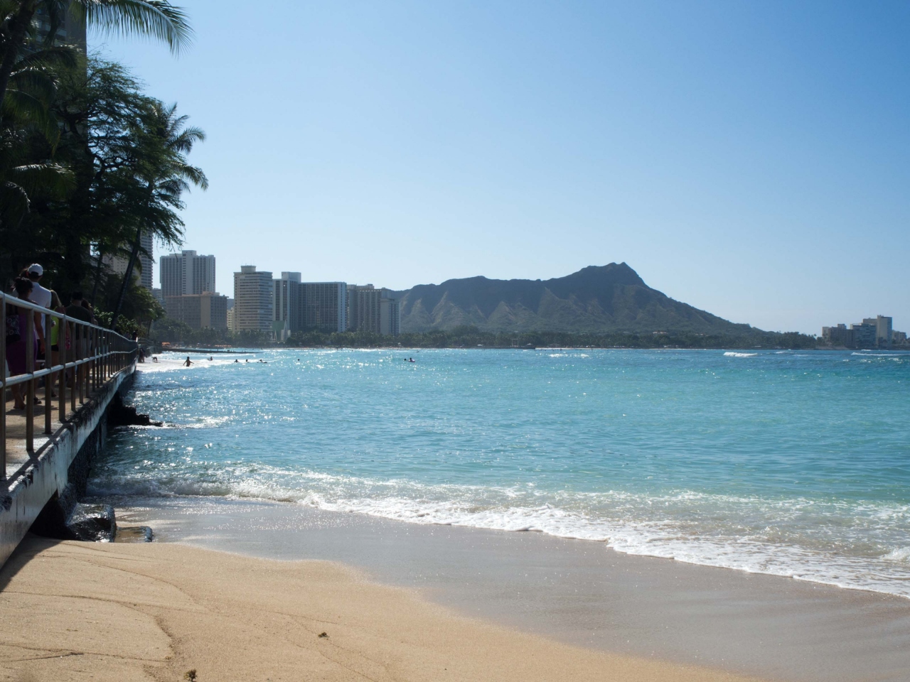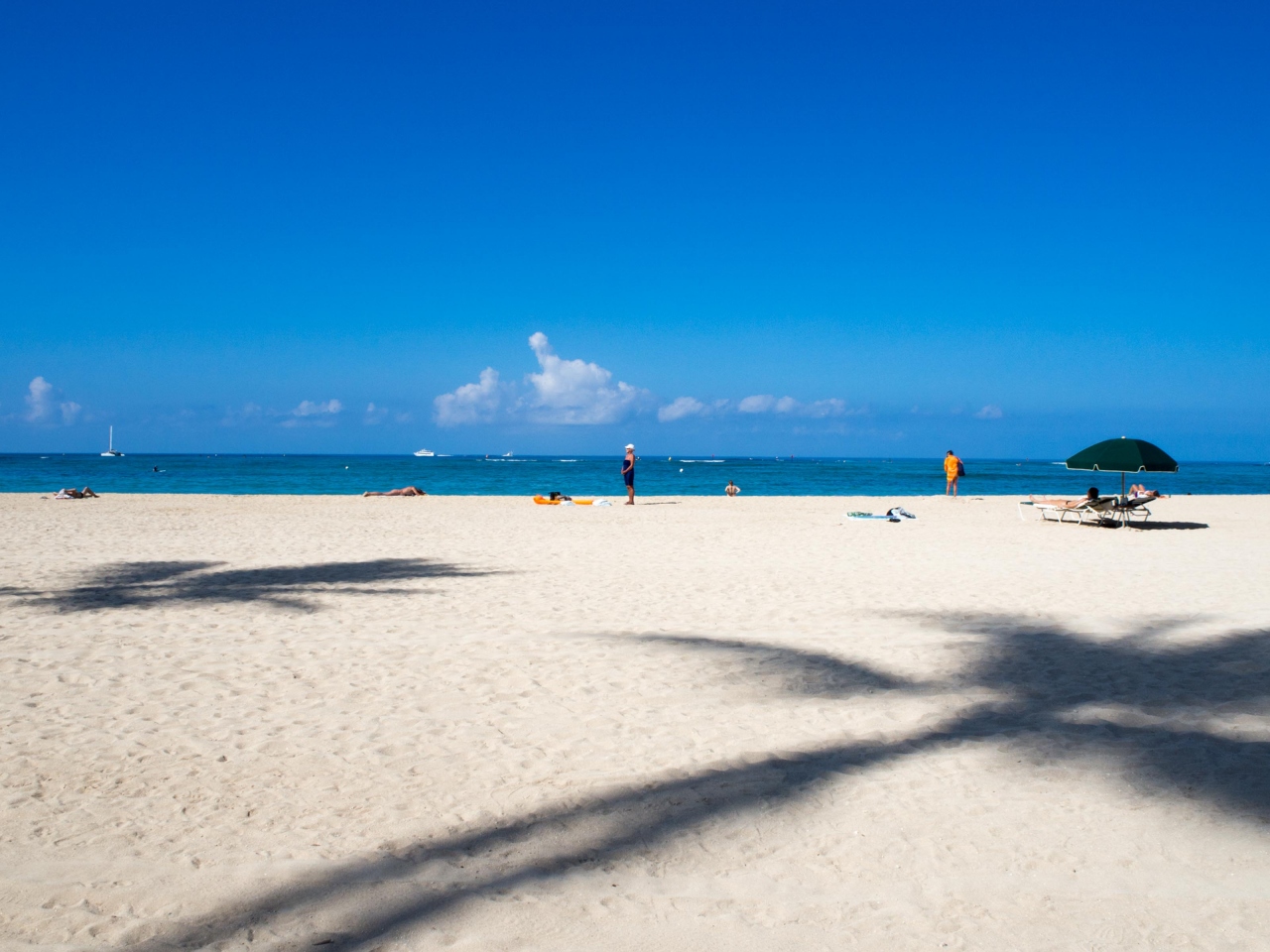 ヒルトンハワイアンビレッジのビーチからカピオラニ公園の前のビーチまで海沿いにずっと歩くことができます。ホテルがずーっと隣接しているので、ホテルが変るとその前のビーチパラソルの色も変わりそれを眺めながらの散歩がとても楽しいです。シェラトンの前の海にはウミガメが来ているのを見たことがあります。ヒルトンの白いパラソルからはじまり、ハレコアの青、モアナサーフライダーのピンク スタービーチクラブの黄色と色がかわり楽しい気分になります。