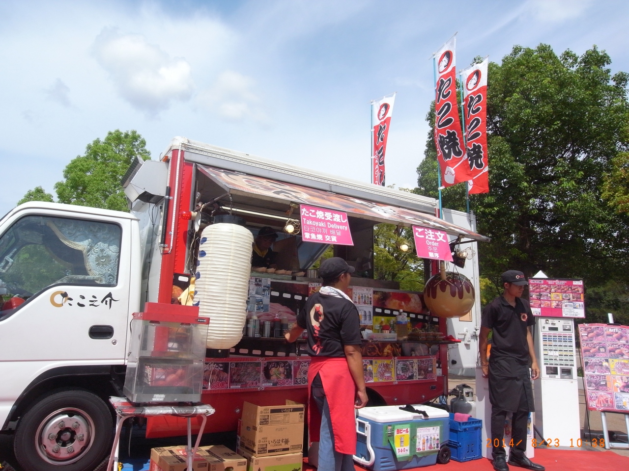 今年の夏里帰りして、大阪城の天守閣に登りました。すごく暑いい日でしたがたこ焼きが食べてくなって、屋台ないかなと探したら天守閣のちょうど正面に何軒か屋台があるちいさな広場がありその中の一軒にたこの介といゆワゴン車のたこ焼き屋さんがありました。期待してなかったけど、超レベル高い味で感動しました。とろっとやわらかくて、ふにゃとしてます。あまくて、だしのあじもしてファンになってしまいました。大阪のたこやき恐るべし