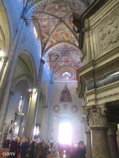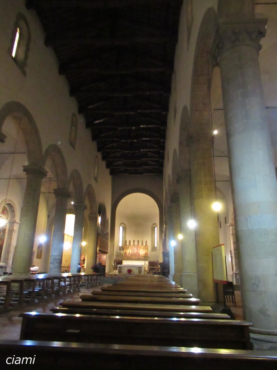 ヴァザーリの「キリストの洗礼」、ドナテッロの洗礼盤の彫刻、アンドレア・デッラ・ロッビアの彩色陶板、主祭壇のステンドグラスや、天井のフレスコ画、とにかく広くって見どころがいっぱいの教会です。