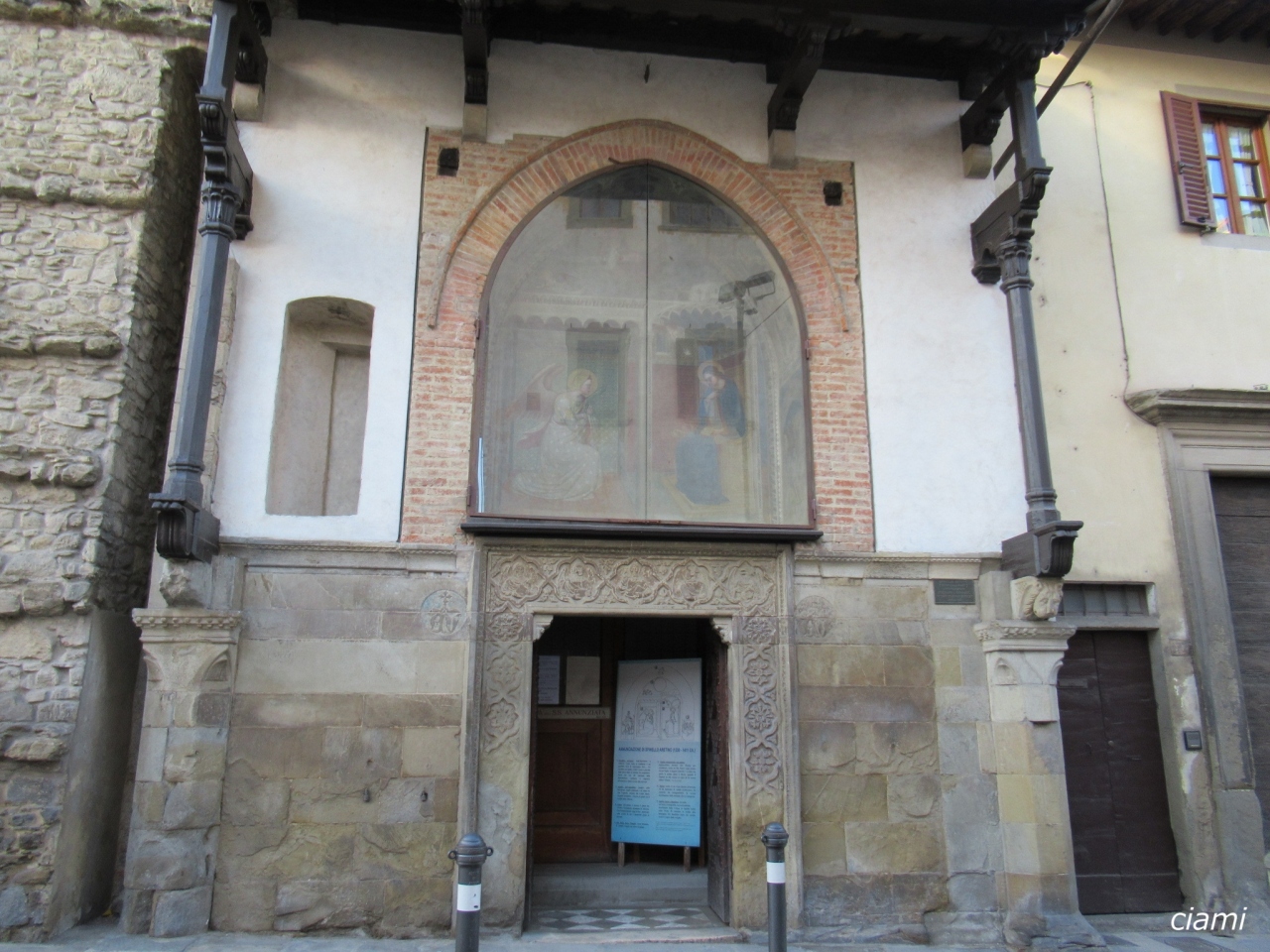 入口の上に、スピネッロ・アレティーノの受胎告知のフレスコ画があります。教会でも、お勧めの絵らしく、解説版もありますけど、ガラスのケースの奥なのと、高いところにあるので、肉眼だと見にくいです。