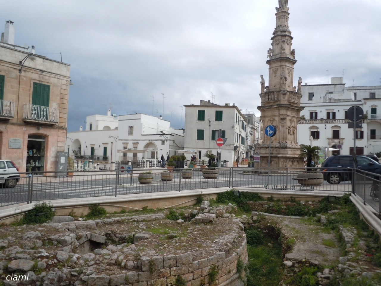リベルタ広場の目印、サントロンツォの尖塔は、ペストからオストゥーニの街を守った聖オロンツォを祀るために立てられたそうです。- 旅行時期