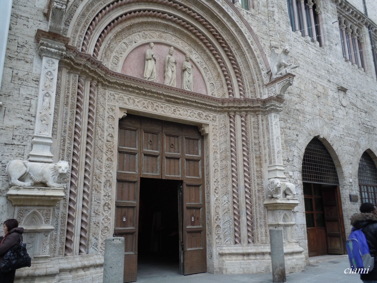 メインの入口は守護聖人の聖ロレンツォ、聖エルコラーノ、聖コスタンツォの彫像で守られていて、プリオリ宮の入口は、グエルファ党のシンボルのグリフィン、ペルージャの象徴のライオンに警備されています。