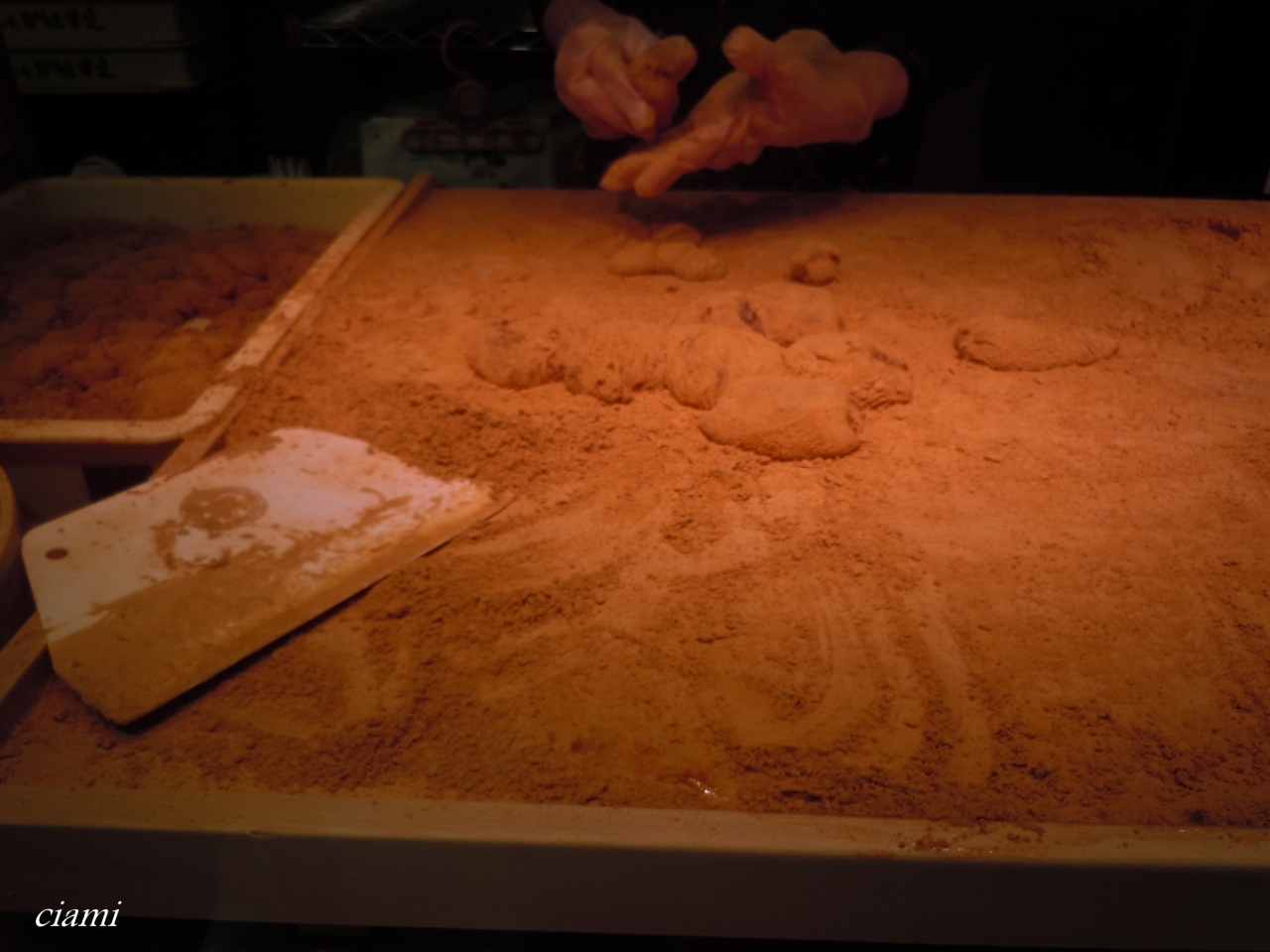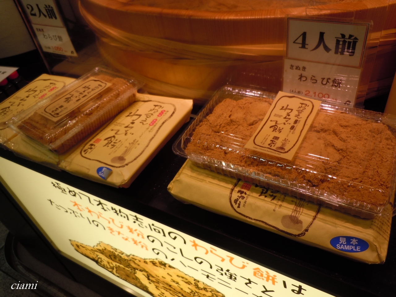 店員さんがの器用な手さばきで、丸いわらび餅をあっという間に一口サイズにしていきます。