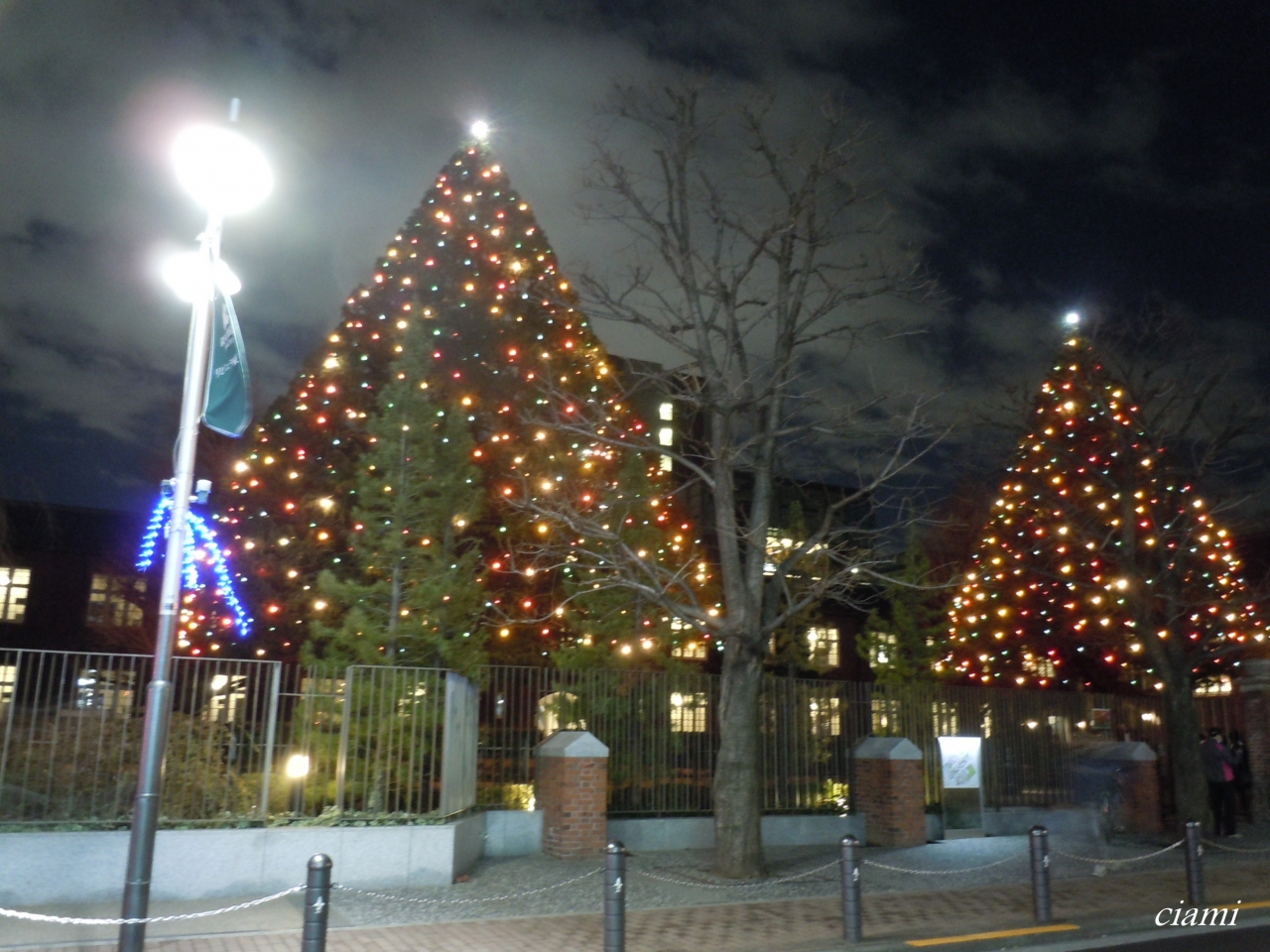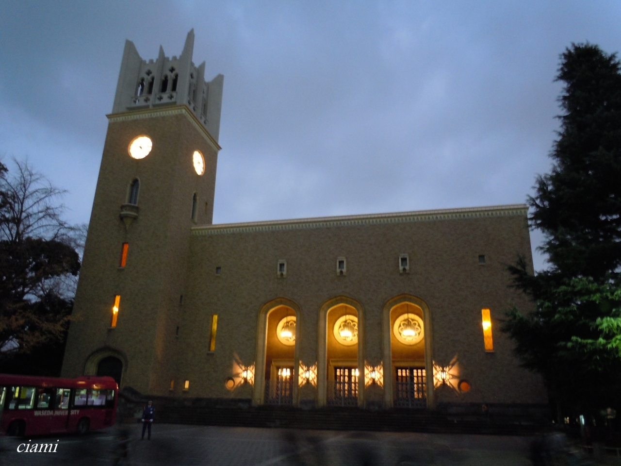 初めて見た大隈講堂は、灯りが点いて堂々としたたたずまいでした。