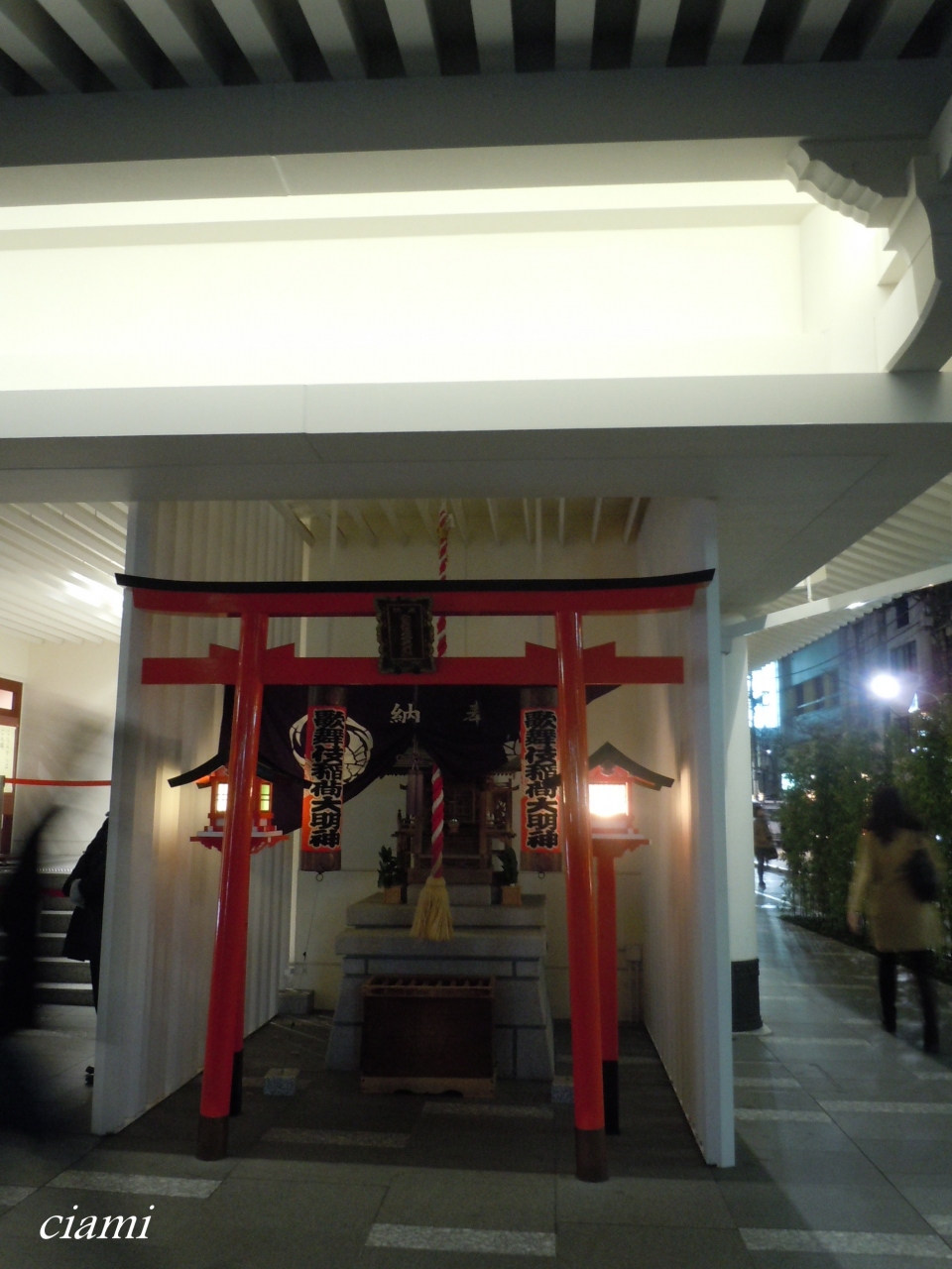 前は、歌舞伎座の右側にあって、中に入らないとお参りできなかったと思うんですけど、今は大通り沿いになって、わたしたちもお参りできるようになりましたね。