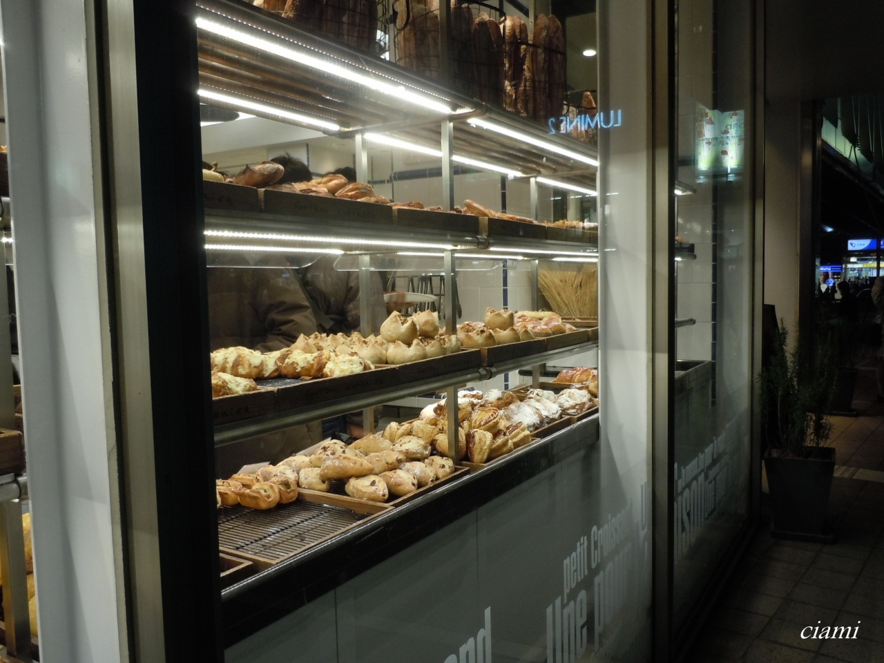 パン置いてあるスペースは狭くて込んでますけど、通路沿いにグルっと回ると全部のパンが見られます。