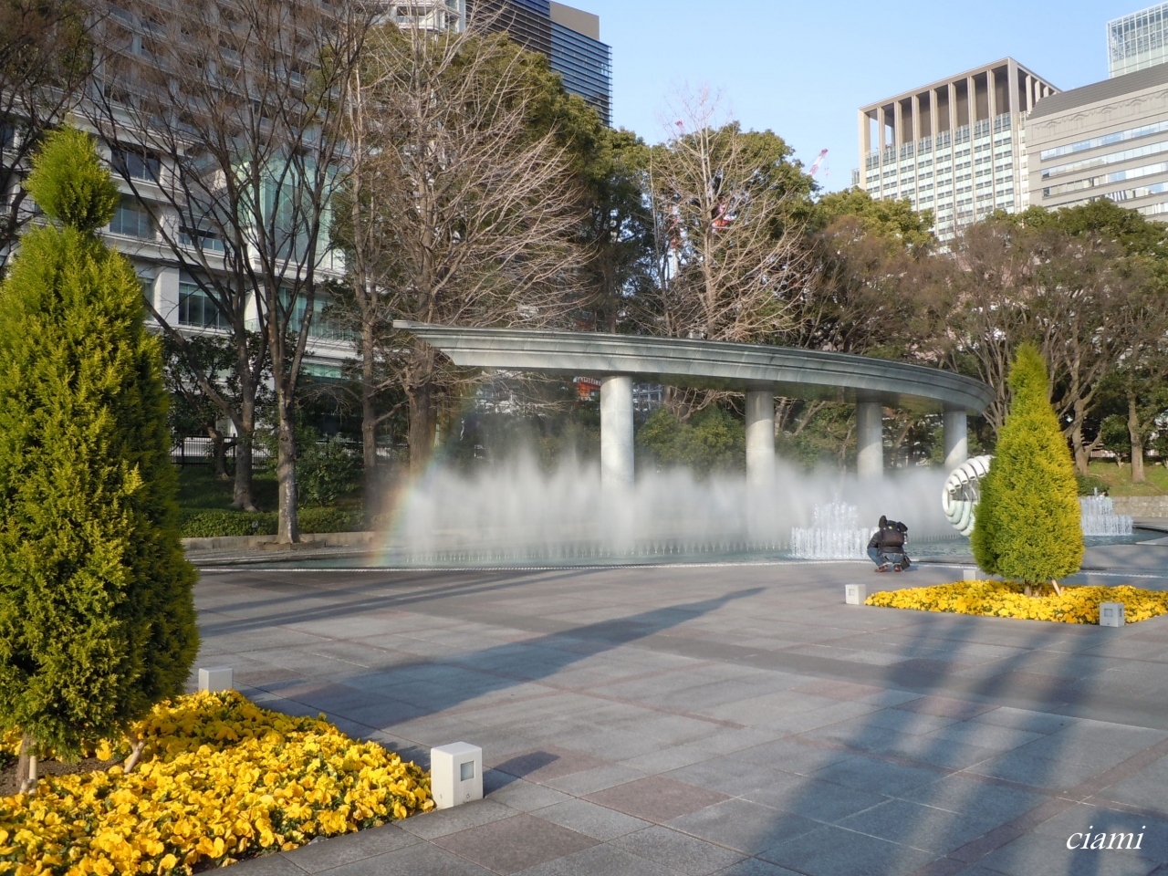 昼間は噴水に日が当たって虹が見えるし、夜はライトアップされた噴水とオフィスビルの灯りが幻想的です。
