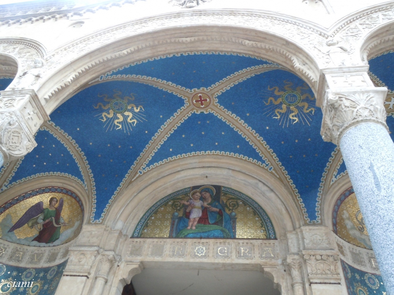 入口のポルティコは、金をバックに、マリア様が珍しくキュートなキリストを抱いたモザイクで飾られています。