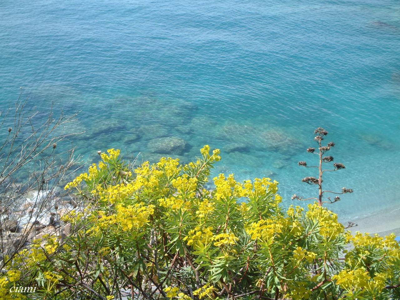 もう1つのヴュースポットはサンロレンツォ・教会前の広場。カラフルな町並みのむこうに海が広がってます。