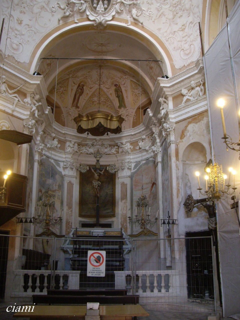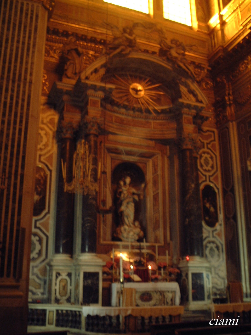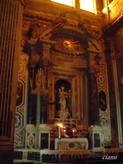 階段を上がって中に入ると、中は巨大で、大きい6つの礼拝堂があります。左側の一番奥の礼拝堂には、木のマリア様が飾られていますが、幸運を呼ぶマリア様として、ジェノヴァの人から愛されているそうです。小さいですが、上品なマリア様です。
