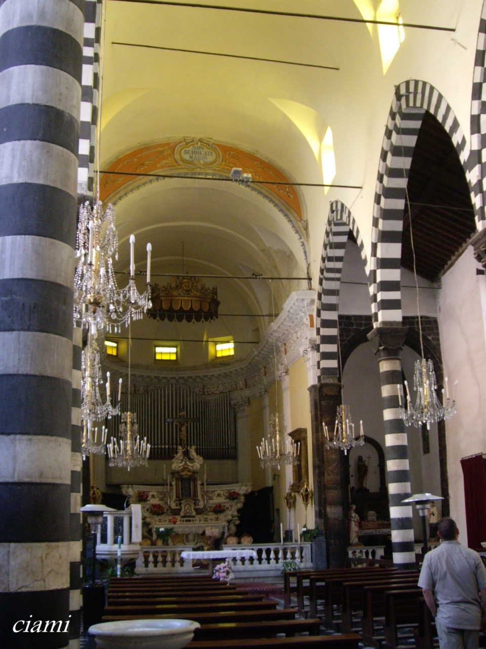 中はリグーリアらしい緑と白のシマシマで、薄暗い中に大理石の説教壇が浮かび上がっています。