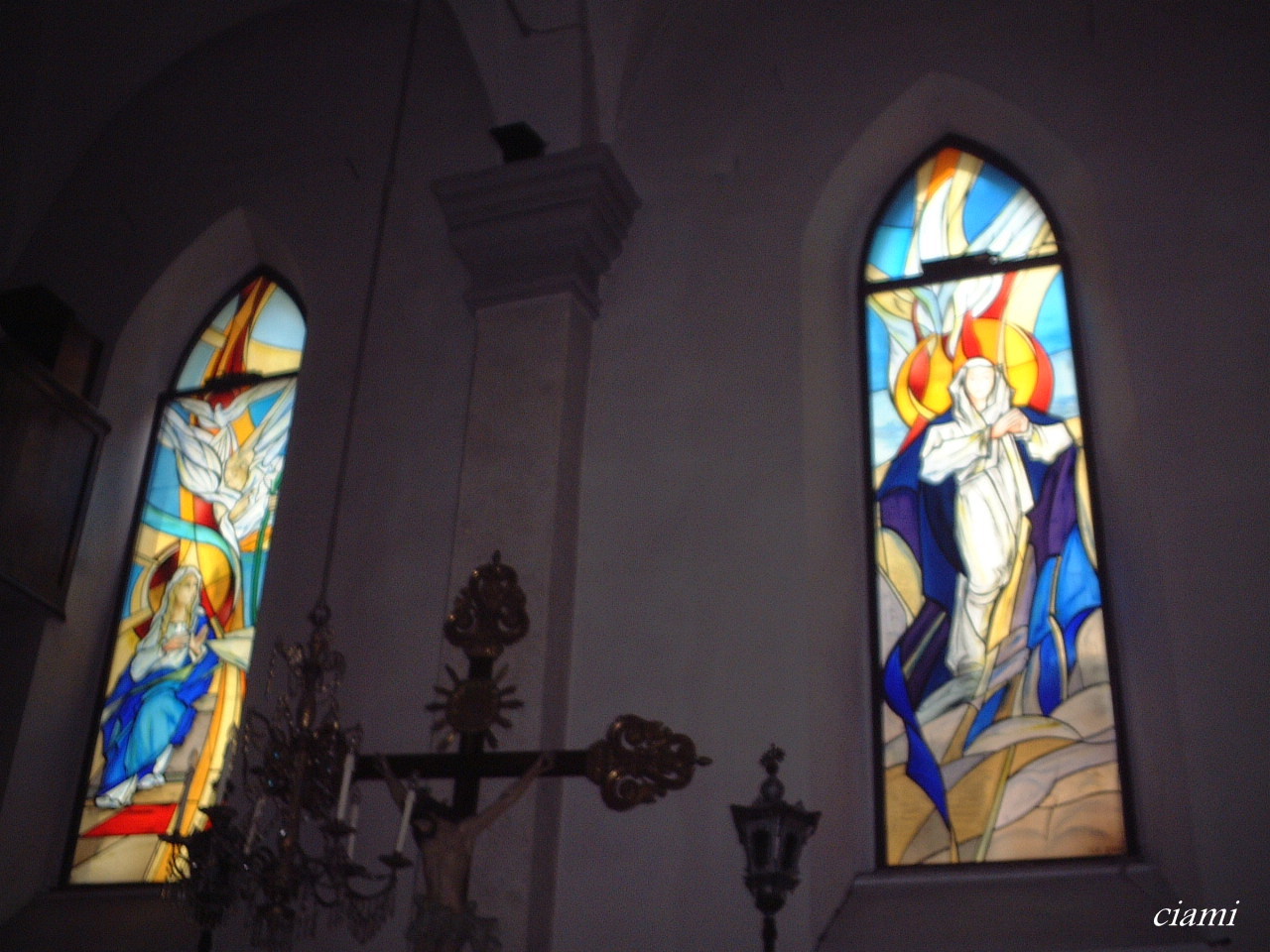 中は暗くって目が慣れるまでに時間がかかります。堂内を明るくしてるのは、モダンなステンドグラスで、天使がマリア様を迎えにきた図柄が印象的です。