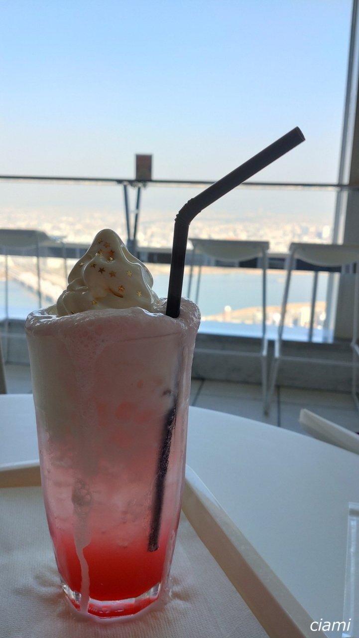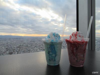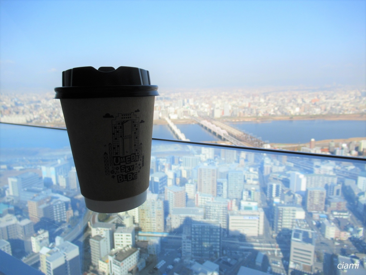 空中庭園展望台のカフェで、40階の高さから大阪の街を見下ろしながらお茶できます。