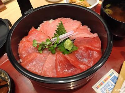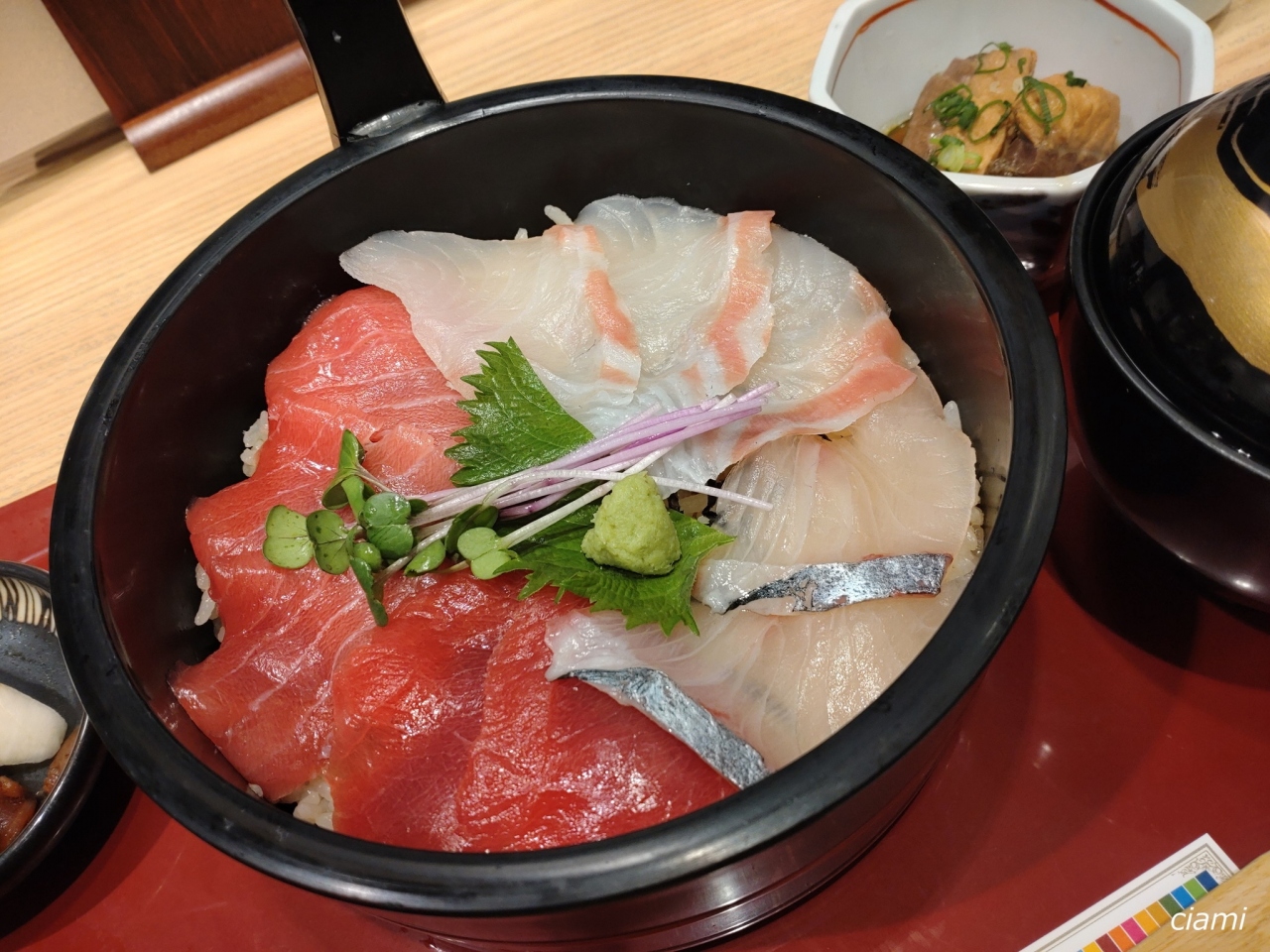 マグロづくしの手桶寿司と、マダイとシマアジ入った、近大紅白手桶寿司をいただきました。