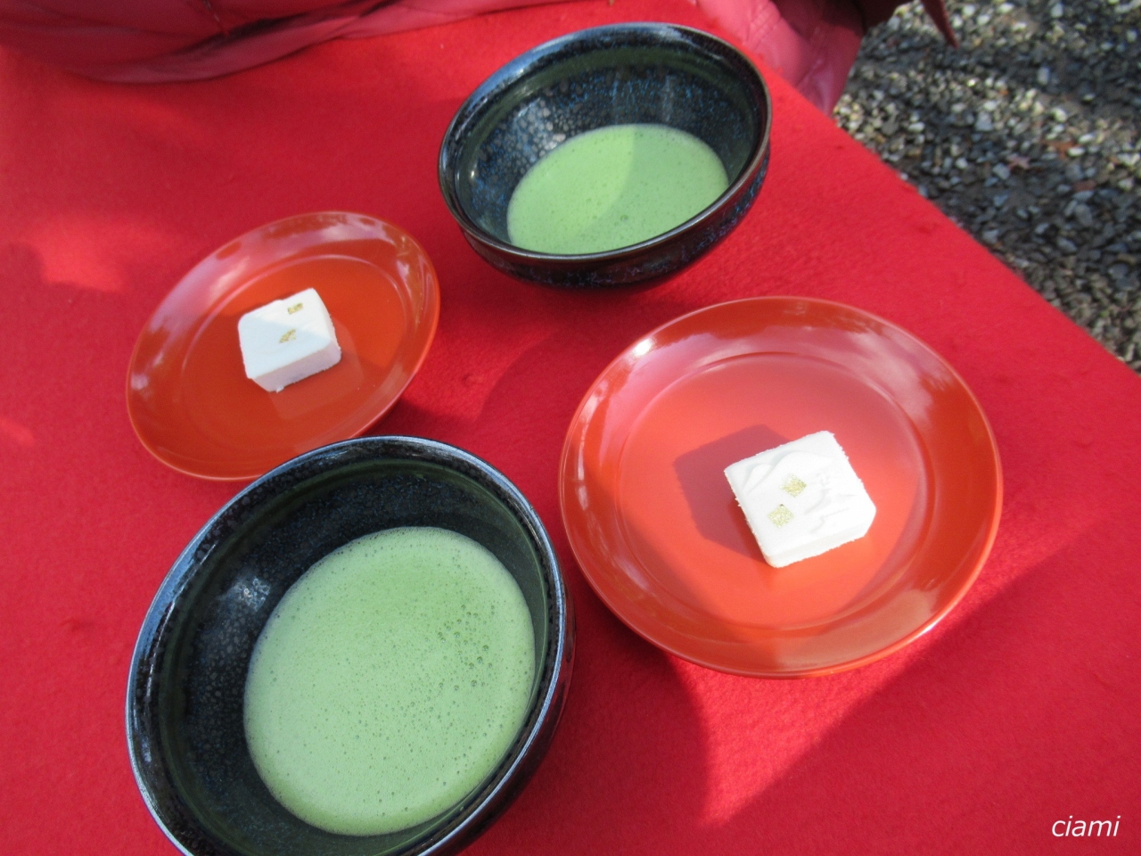 お抹茶と干菓子が付いて500円と値段も手ごろです。干菓子は「金閣」という金箔が付いた真っ白い落雁で、しょっぱめのあんこが入った上品な味でした。- 旅行時期