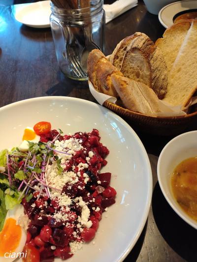ランチで、ビーツとひよこ豆のサラダとパンのセットをオーダーしました。