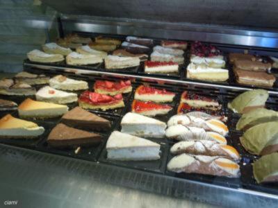 イタリアには珍しく、カラフルな色のケーキがたくさん並んでいます。
