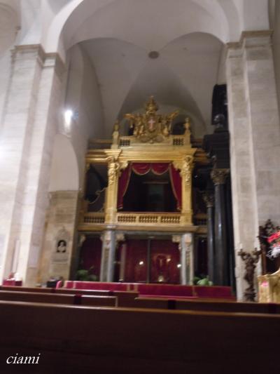 聖骸布の礼拝堂は、入って左の一番奥です。聖骸布は、何回か火事にあっていることもあって、防弾・防水・防火処理されたガラスで守られています。