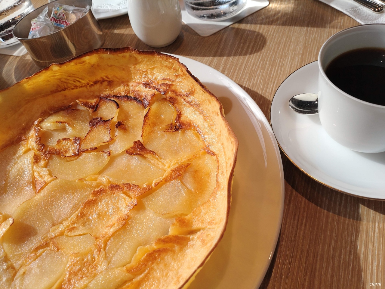 いただいたのは、ジャーマンアップルパンケーキ。シャキっとしたリンゴがたくさん入ったちょっと変わった形のパンケーキで、ここの名物なんだそうです。