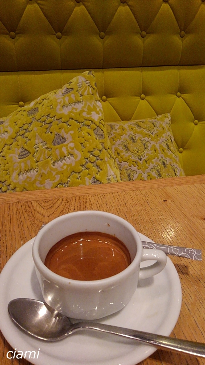 ミモザ色のふわふわのソファに、ミモザ色のクッションで、雰囲気はいいです。コーヒーの味は普通です。- 旅行時期