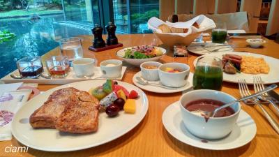 アメリカンブレックファーストとパンケーキブレックファーストのフレンチトーストをオーダーして、2人でシェアして池の睡蓮眺めながらゆっくりいただきました。