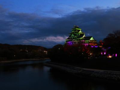 烏城という別名をもつ岡山のシンボルともいえる岡山城。天守を間近で見るのもいいですが、旭川の対岸の後楽園側から眺める風景も非常に美しい城です。今回はイルミネーションイベント期間中に訪問しましたが、天守の周辺が装飾を施されていましたが、天守本体へのライトアップされていたため、遠くからも近くでも楽しめるイベントでした。
