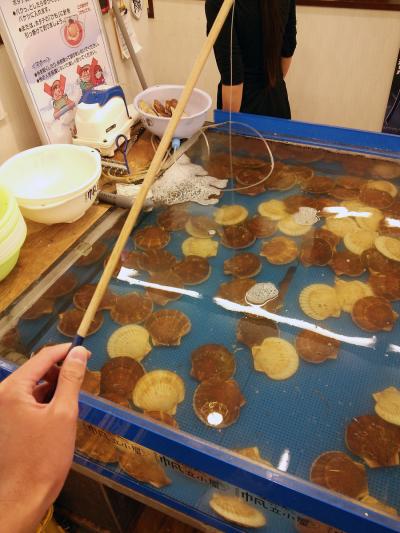 ここの名物はホタテ釣りができることで、500円で3分間釣ることができ、釣った分だけ食べることができます。釣ったホタテは網焼きや刺身などにしてくれ、網焼きはテーブルに備え付けのコンロで焼くことができます。