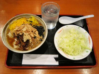 鶏飯は鹿児島県奄美地方の郷土料理で、白ごはんの上に鶏肉や錦糸卵などの薬味を乗せて出しをかけていただくダシ茶漬けに近いもの。ここではその鶏飯がバイキング形式になっており、注文するとどんぶりとサラダボールが配られ、あとは自由に鶏飯とサラダを食べ放題となります。