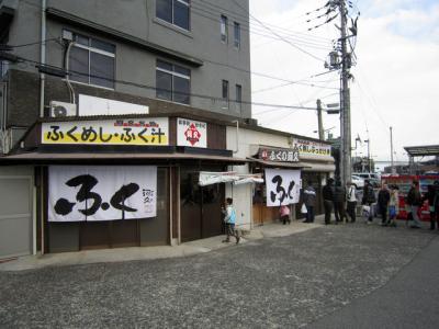 唐戸市場と海響館のほぼ中間にある、ふぐ(ふく)料理店。最近何かで紹介されたらしく行列が気になり1時間ほど並んで入店。