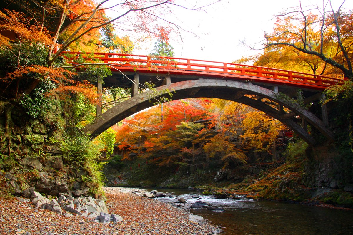 入り口にかかる橋は、河原へ降りて眺めると背景の紅葉と絡んで見事で、2012年の阪急の紅葉ポスターにも採用された場所です。