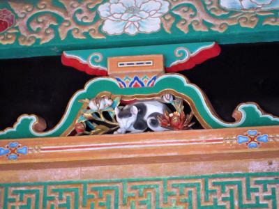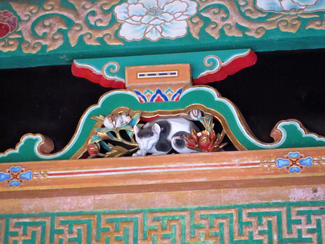 奥院に向かう入場料料金所からすぐの場所の頭上にあり、言われなければ気付きません。この猫は爪を立てていることから、いつでも臨戦態勢とも言われる一方、この眠り猫の裏側には雀が彫刻されており、平和表しているとも言われています。- 旅行時期