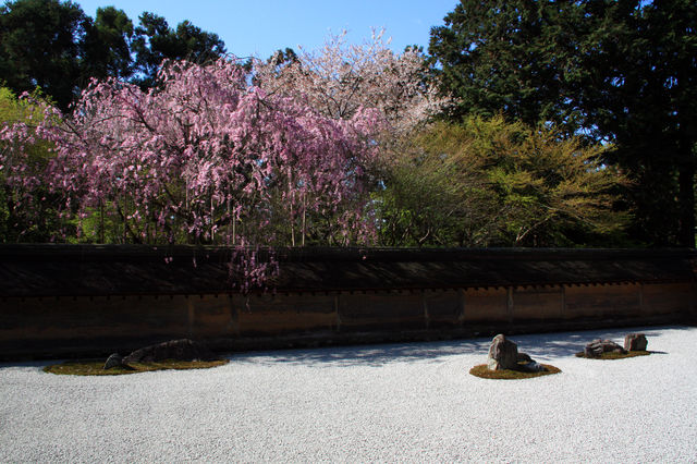 この石庭は枯山水の庭園で、白い砂は海の波を表しています。そして全部で15個の石が配置されているのですが、庭園のどこから見ても一度に15個を見ることはできない(どれかが陰に隠れてしまう)ということでも有名です。- 旅行時期