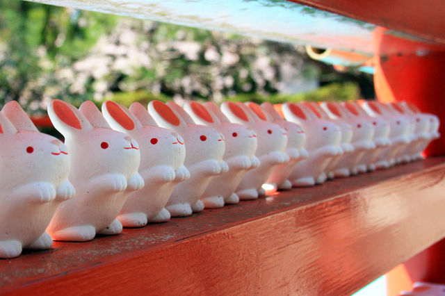 ここ岡崎神社は平安京を守るため都の四方に建てられた神社のうちの一つで、ウサギが神の使いとして祀られていることから境内のあちこちにうさぎがいます。