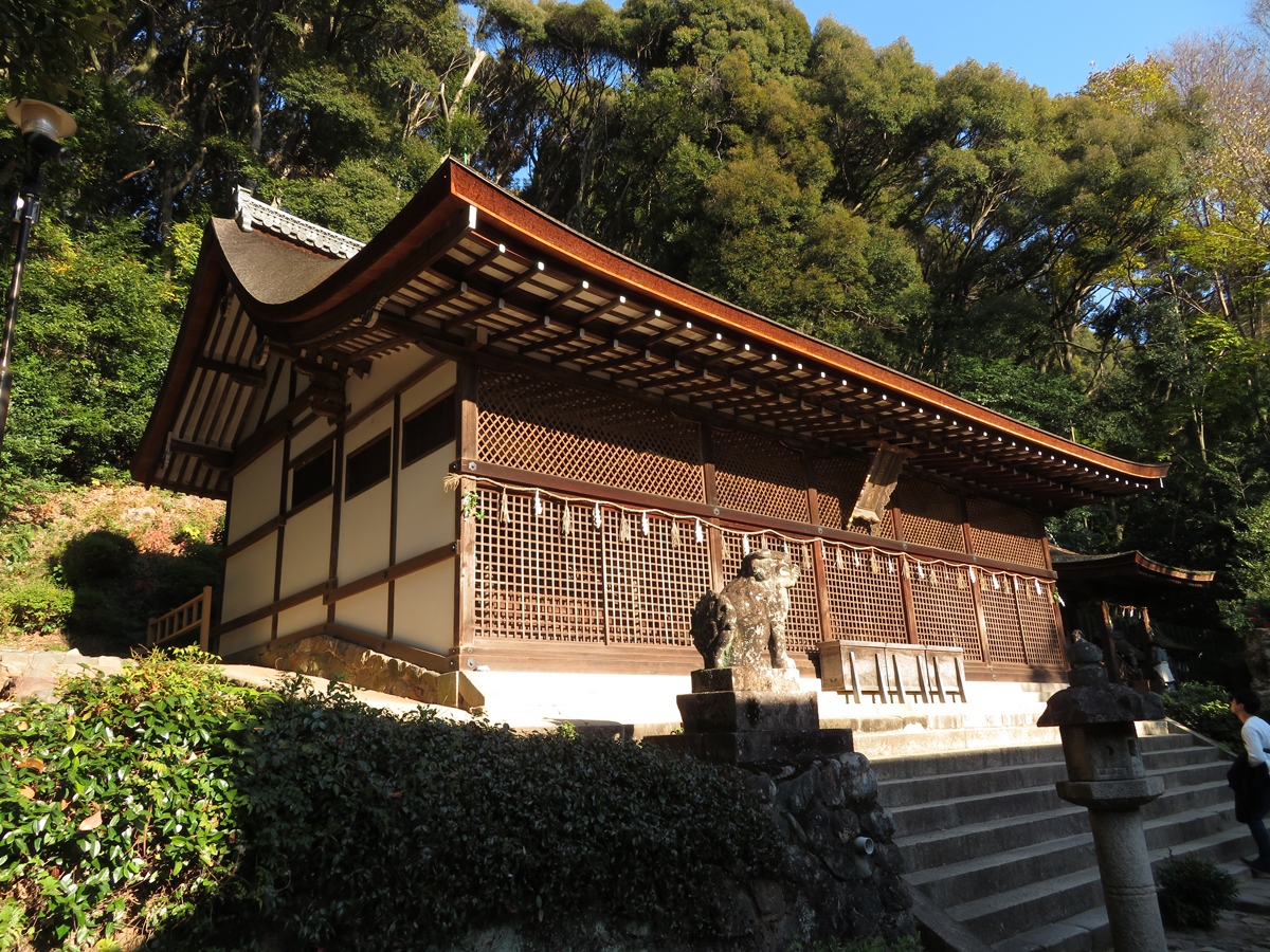 平等院の北、宇治川の対岸にある神社で、平等院とともに世界遺産に指定される神社です。平等院の賑わいに対して、山の麓にあって静かな印象の神社です。拝殿、本堂はともに国宝に指定され、特に階段の上に建つ本殿は、神社建築でも最古とされている貴重な建造物です。拝殿とともに桧皮葺が美しく、落ち着きのある建築です。平等院と並んで、ぜひ訪れたい場所です。