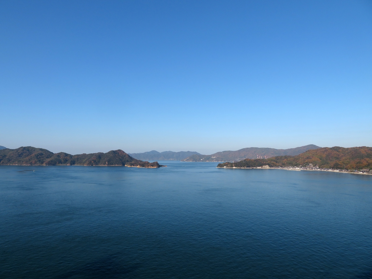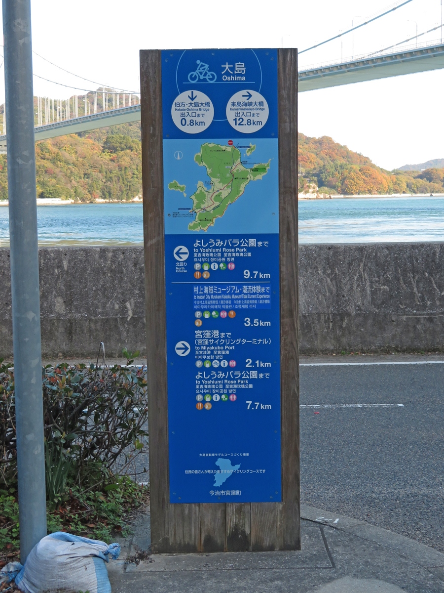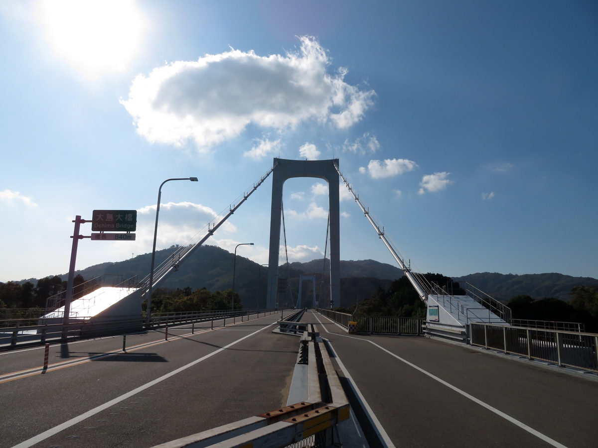 しまなみ海道で尾道側から6つめ、今治までで最後の島が大島です。今回はしまなみ海道走破サイクリングで訪れましたが、しまなみ海道サイクリングコースで随一の起伏がこの島に存在します。その為体力的にはそれに留意した上でここまで走ってくる必要があります。サイクリングコースは島を斜めに縦断するような形で通っているため、2つほど峠を超える必要がありますが、前半は東側を海岸沿いに走ることになり、村上水軍の城として知られる能島城跡を見ることが出来ます。能島城の付近は、潮の干満の影響もあって、非常に潮流が速い場所で、訪問時も音を立てて流れていました。