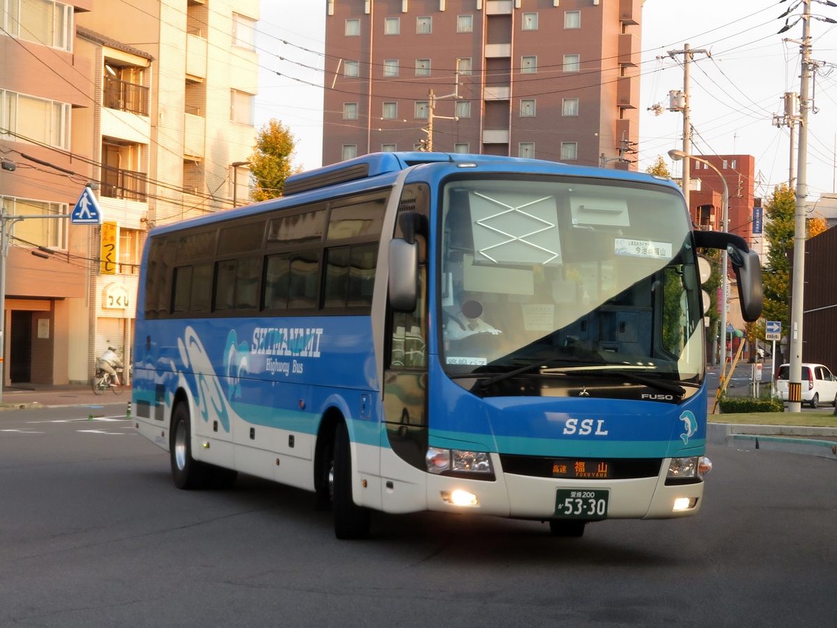 今治と福山を結ぶ高速バス、しまなみライナー。今回は2日間に及ぶしまなみ海道サイクリングの復路として、今治駅前16:20発のバスを利用しました。途中尾道方面乗り換えため、大浜PAに隣接した因島大橋バスストップなどに停ります。福山駅前17:49着でしたが、四国と本州を結ぶルートとして、景色もよく、速達性もあり非常に便利でした。この路線はいくつかの会社の共同運行ですが、今回は瀬戸内しまなみリーディングの運行便で、発車、到着のアナウンスの前に瀬戸の花嫁がBGMとして流れ、旅情を掻き立てていました。