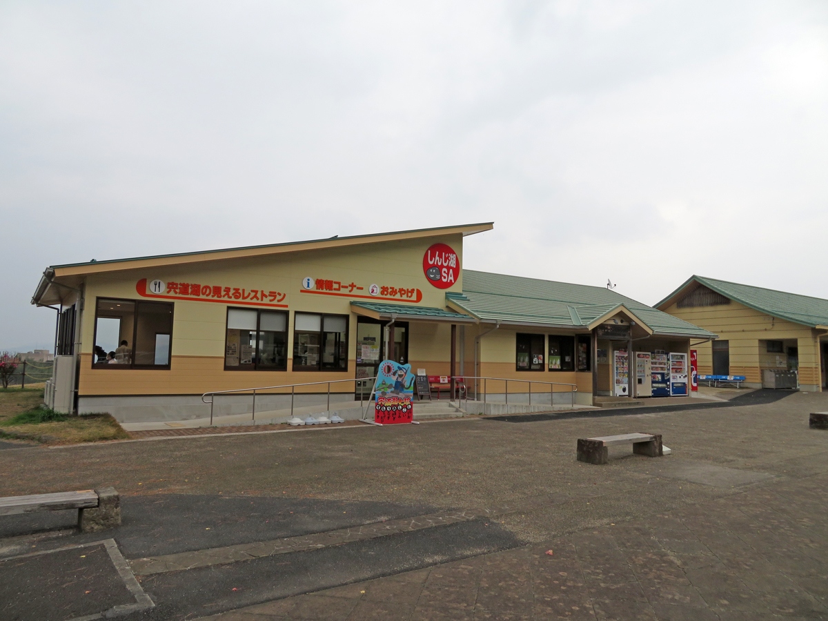 山陰道にあるサービスエリアで、高台にあることからその名称の通り宍道湖を臨むことができる場所にあります。駐車スペースは今回の訪問時は余裕が多くありましたが、全体の収容台数自体はそこまで多くありません。山陰道自体が比較的新しいこともありますが、このサービスエリアも設備は比較的新しい印象で、お土産とレストランなどが入る建物と、トイレの建物が別棟になっています。規模自体は大きくありませんが、お土産物も山陰の名産品が一通りそろっていました。